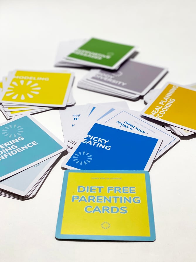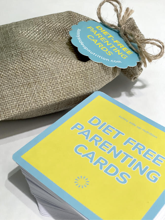 Diet culture is everywhere and parenting can be hard, exhausting and confusing, at times. As parents, we are bombarded with messages about how to feed our children. This card deck is meant to serve as an antidote to the many diet culture messages we all absorb each day. Pull out a card or 2 or 5 when you need help challenging diet-culture.